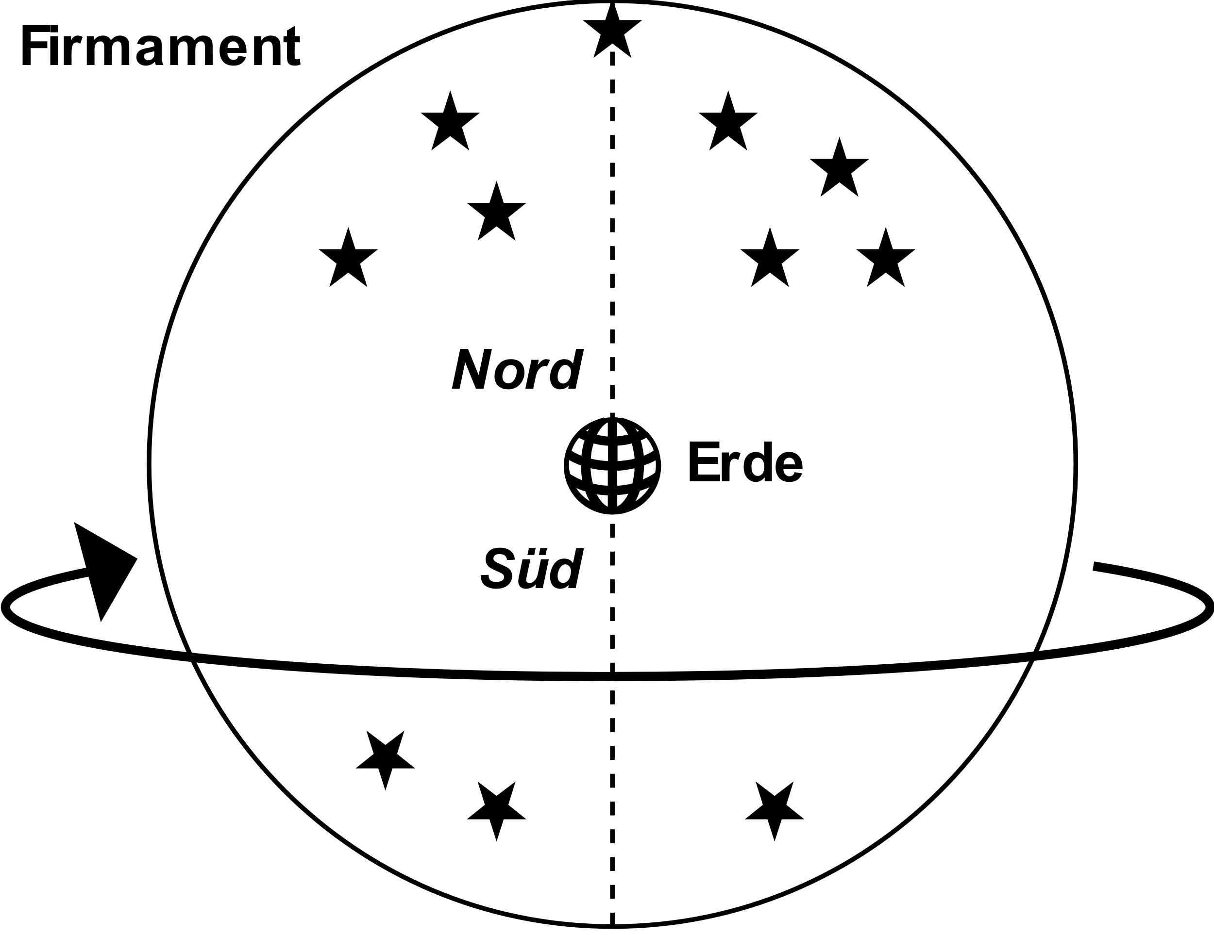 Mit der Zeit haben wir festgestellt, dass die Welt in Wirklichkeit anders aussieht, aber um die Angelegenheit mit dem Himmelsnordpol zu klären, reicht uns diese Vorstellungswelt: Die Erde ist eine Kugel, auf der wir leben, umgeben von einer Hohlkugel, auf der die Sterne angebracht sind. Diese äußere Sphäre, das Firmament, dreht sich. Dazu wurde ein gläserner Spieß durch Erde und Firmament getrieben, um den sich das Firmament dreht, während die Erde steht. Ich glaube das alles entspricht keiner der antiken Weltvorstellungen zu einhundert Prozent. Aber wie gesagt: Es ist eine praktische Arbeitshypothese, die wir im Anschluss wieder in die uns bekannte physikalische Realität übersetzen werden.