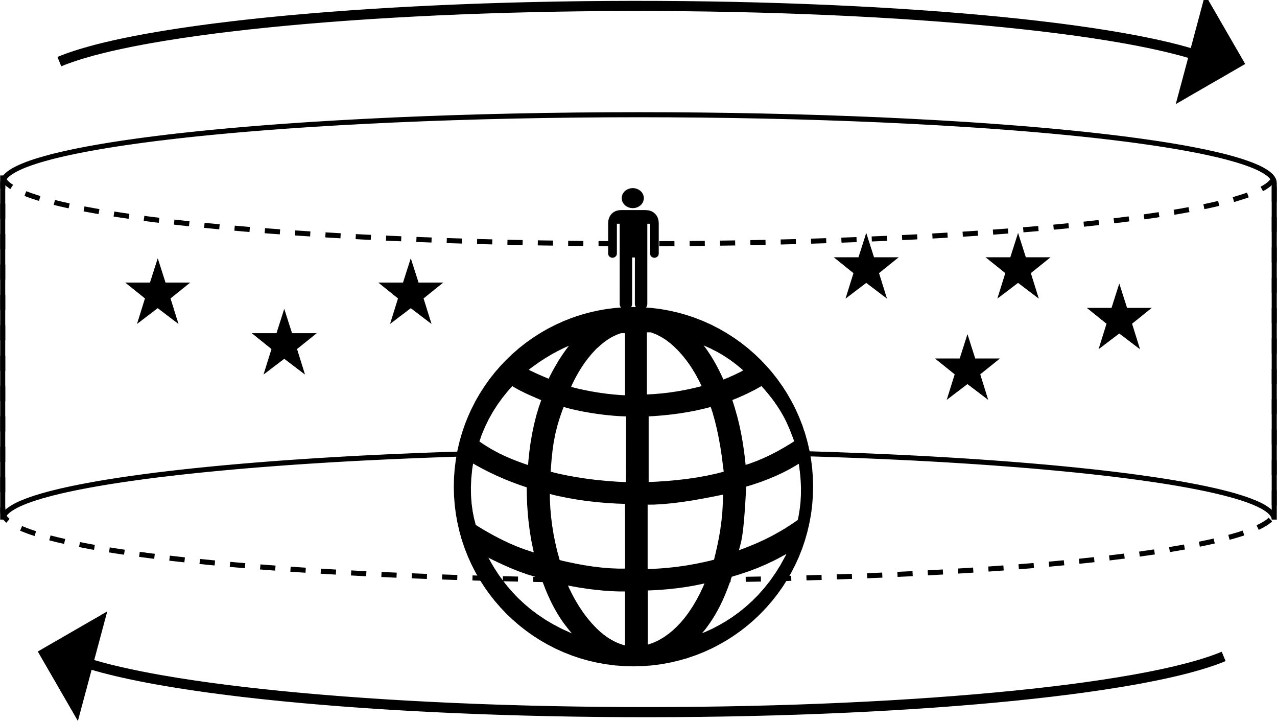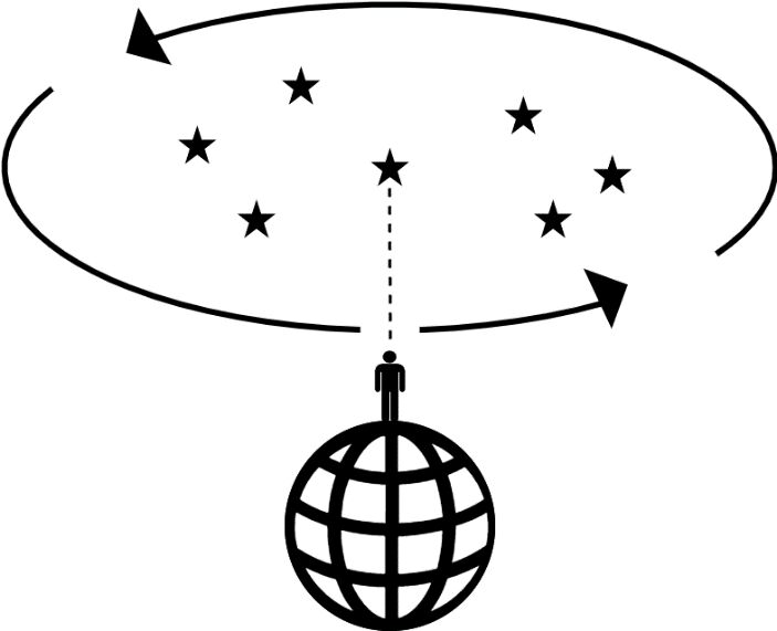 Um das alles zu erklären, machen wir zunächst wieder eine Reise in die Vergangenheit. Wie stellte man sich früher die Himmelsmechanik vor? Es gab natürlich über die Jahrtausende verschiedene Erklärungsansätze und Vorstellungswelten. Manche sehr phantasiereich, andere durchaus mit guten logischen Ansätzen. Stellen wir uns mal vor, die Sterne wären nicht in den Tiefen des Weltalls verstreut, sondern sie wären Pünktchen, die auf eine Hohlsphäre (eine hohle Kugel) gemalt wurden, die die Erde umgibt. Von dieser Vorstellung rührt auch das Wort Firmament her. Man dachte, die Sterne wären an einer Art gläsernen Sphäre angebracht, die über der Erde schwebt, hängt oder was auch immer – das Firmament. Auch wenn das nicht der physikalischen Realität entspricht, ist es eine sehr gute Beschreibung dessen, was wir sehen. Diese Sphäre um uns herum dreht sich nun also. In Wirklichkeit dreht sich die Erde und nicht die Außensphäre, aber für uns als Beobachter macht das keinen Unterschied.