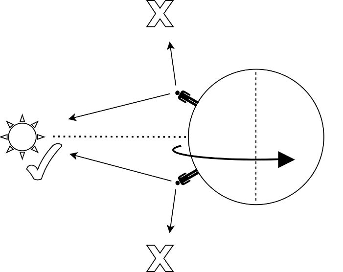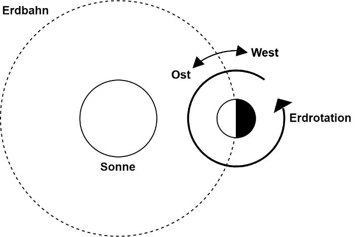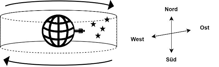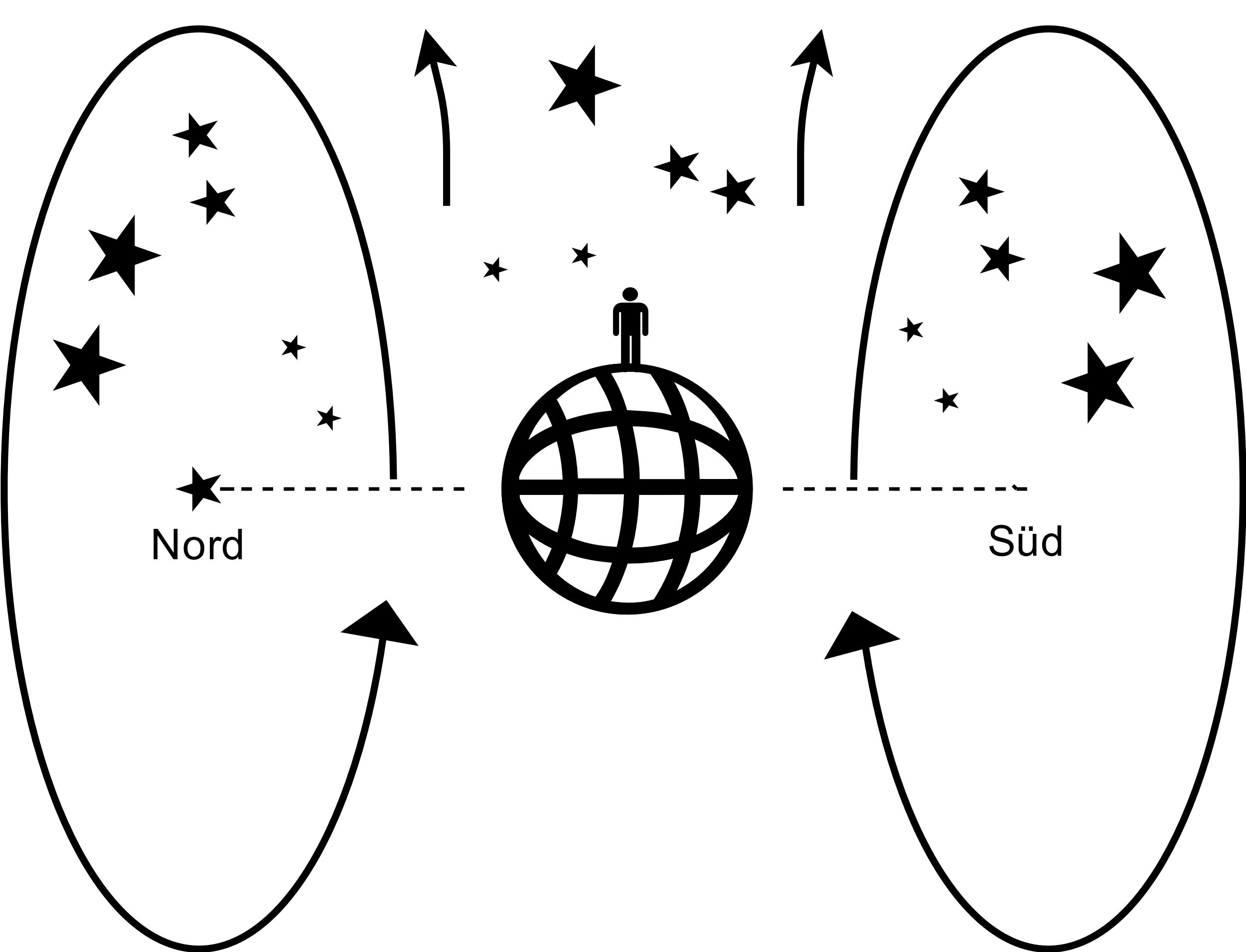 In der Realität dreht sich nicht die Himmelsphäre um die Erde, sondern die Erde rotiert, während der Himmel stillsteht. Aber denken Sie an die zwei Züge im Bahnhof. Welcher fährt und welcher steht? Man kann den Unterschied visuell nicht ausmachen. Anstatt, dass sich das Firmament von oben (Norden) aus betrachtet, im Uhrzeigersinn dreht, dreht sich stattdessen die Erde gegen den Uhrzeigersinn um sich selbst. Das kommt am Ende für den Betrachter aufs Gleiche raus.