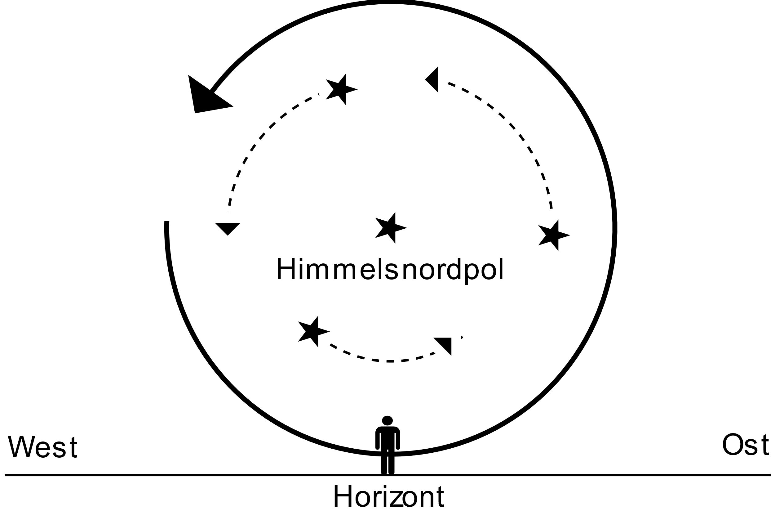 Der ganze Himmel wandert stetig von Ost nach West. Der ganze Himmel? Der ganze Himmel mit Ausnahme eines kleinen gallischen Dorfes, das sich Polaris oder Polarstern nennt. Dieser Stern liegt zufällig in der Nähe des Himmelsnordpols. Deshalb wandert Polaris nicht von Ost nach West, sondern bleibt stehen. Wenn Sie um 21 Uhr abends über den Schornstein Ihres Nachbarn gepeilt 5 cm nach oben und 2 cm nach rechts den Polarstern sehen und um 4 Uhr morgens erneut aus dem Fenster schauen, dann finden Sie Polaris an gleicher Stelle wieder. (Es wäre natürlich schon großer Zufall, wenn Polaris wirklich in der Nähe des Schornsteins Ihres Nachbarn zu finden wäre.) Wenn Sie nun nicht über den Schornstein Ihres nördlichen Nachbarn hinweg schauen, sondern sich einen Fixpunkt über dem Haus ihres östlichen Nachbarn suchen, werden Sie feststellen, dass die Sterne, die dort um 21 Uhr zu sehen waren, um 4 Uhr morgens über dem Gebäude Ihres westlichen Nachbarn stehen – sie sind nach Westen gewandert. Über dem Schornstein Ihres östlichen Nachbarn sind im Verlauf der Nacht andere Sterne neu aufgegangen.